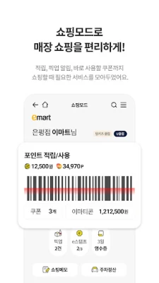 Duba duk fa'idodin ku a wuri guda! 이마트앱 yana nuna muku adadin e-money, maki da za a iya amfani da su, da kuma yawan kuɗaɗen rangwame (coupons) da kake da su a kallo ɗaya, tare da sanarwa masu mahimmanci da kada su wuce ku. Tare da Katin Maki na 이마트앱, wanda ke aiki da barcode guda ɗaya, za ka iya tara Shinsegae maki, amfani da e-money da kuɗaɗen rangwame, har ma da samun hatimi a lokaci guda, duk cikin sauki. Hakanan, za ku iya gano kayayyakin da kuke buƙata da sauƙi, ku ga farashinsu, ko akwai su a shagon, har ma ku karanta ra'ayoyin sauran masu siyayya don yanke shawara mai kyau da kuma cin gajiyar fa'idodin kulob na musamman da aka keɓance muku.
